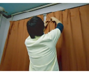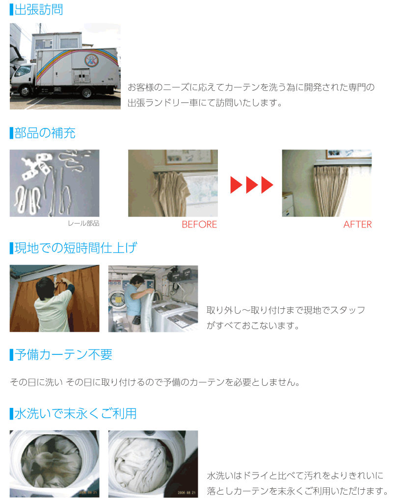 特許取得ランドリー車にて高齢者施設・学校・病院・ホテルなどの施設に赴き、現地にてカーテンの取外しからクリーニングそして簡単な補修から取付けまでの一連の作業を行うサービスです。